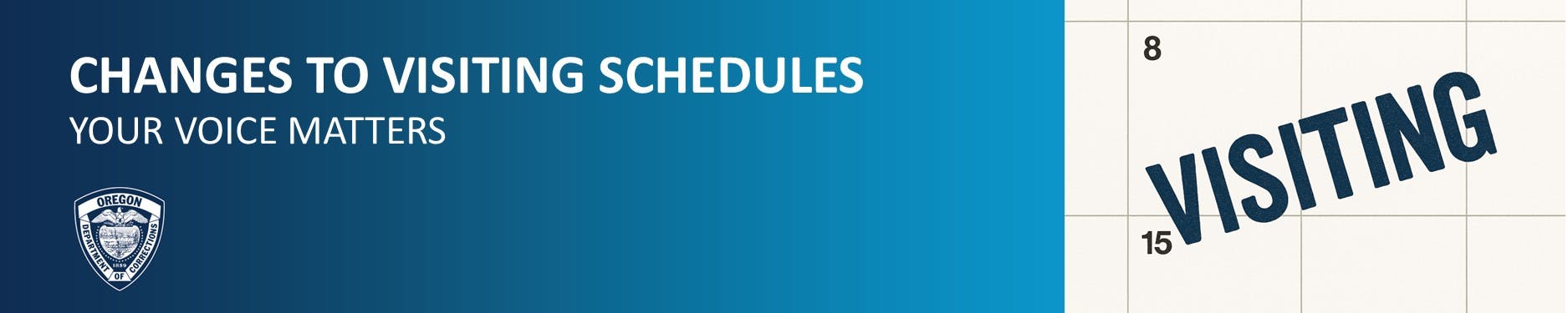As you may know, the Department of Corrections (DOC) is facing serious budget challenges, as are all state agencies. At the same time, we remain fully committed to the safety and well-being of the adults in custody, our staff, and the public. Every day, we work to ensure critical posts are appropriately staffed and overtime is responsibly managed. Given these realities, we want to let you know about upcoming changes to visiting across all facilities.